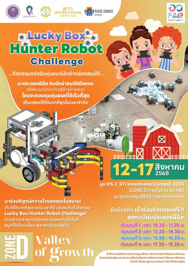 Raise Genius ได้จัด กิจกรรมแข่งขันหุ่นยนต์นักล่ากล่องสมบัติ Lucky Box Hunter Robot Challenge ในงาน อว.แฟร์ 2025 ที่ศูนย์การประชุมแห่งชาติสิริกิติ์